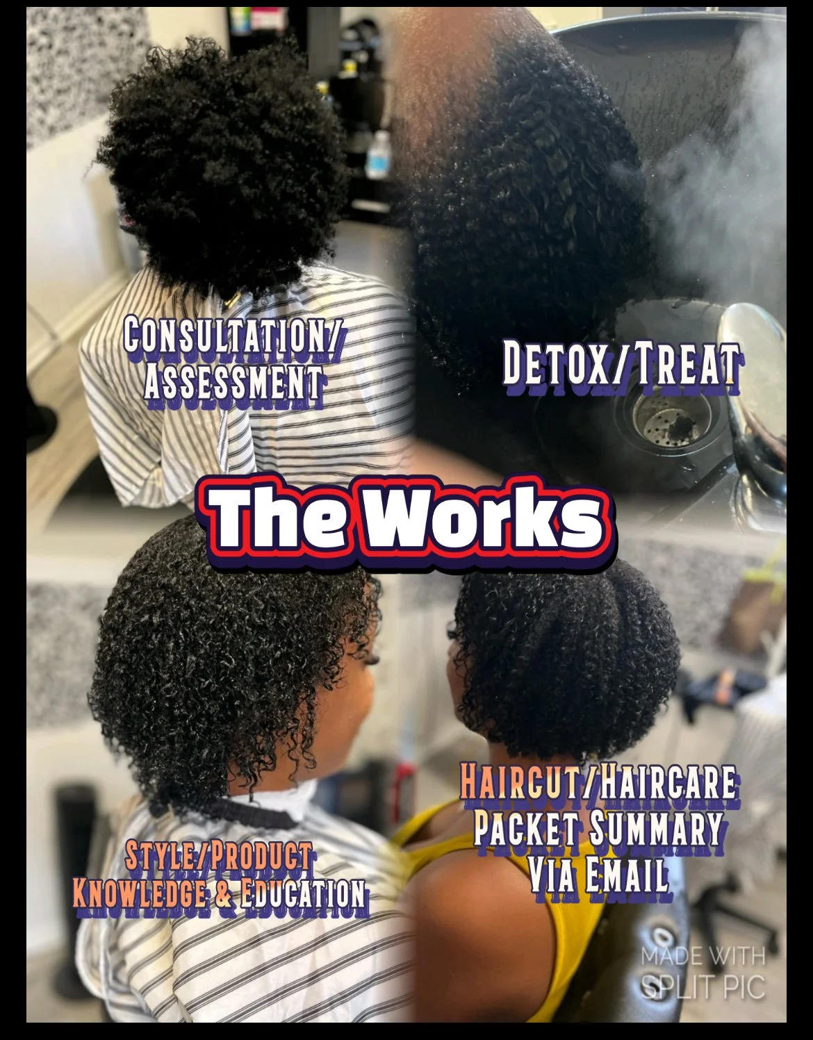 New client: The Works is simply that: A fresh, new start for your hair. You’re ready for healthy, thriving hair. You’re ready to wear & style it. Weaves & Braids have done a number! Highly recommended for new clients, this service includes a full consultation, a scalp and hair assessment, product knowledge & breakdown, personalized recommendations, shampoo detox session, and treatments tailored to your needs. You'll receive a trim/cut for shape & health, plus a natural hairstyle of your choice. You’ll leave with a better understanding of your hair. You will receive maintenance tips and a plan to help you achieve long term hair goals.
